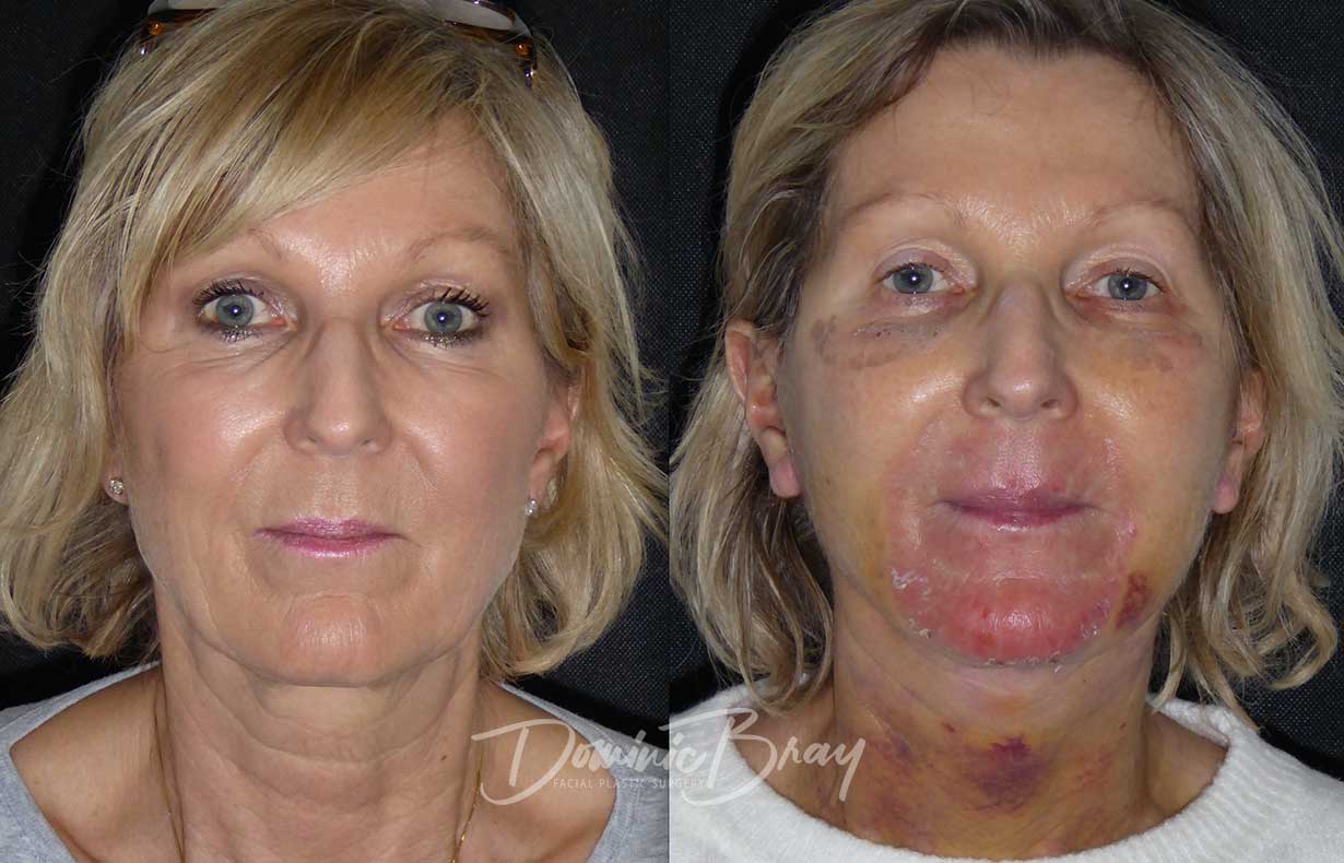 At day 4 a lot of her facelift swelling has reduced and she has technicolour bruising in her neck, this will fade over the next week or so but can be helped with laser when I take out her face stitches at a week. Her facial contours and neck line look brilliant and she is on track for a brilliant result. Under eye C02 laser is healing quickly now as this was a medium depth resurfacing, around the mouth will take longer as it was a deeper resurfacing to really reduce her perioral wrinkles. Laser recovery isn’t painful, but will start feeling itchy over the next few days and be red for several weeks.